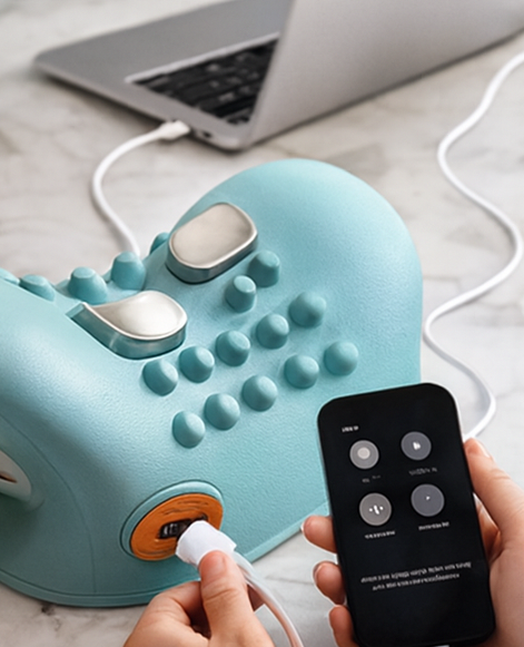 Conecta el cable tipo C a una fuente de alimentación (5V=2A). Usa el controlador lateral para elegir el nivel de tracción, intensidad del masaje y temperatura inicial (recomendado: 40°C).